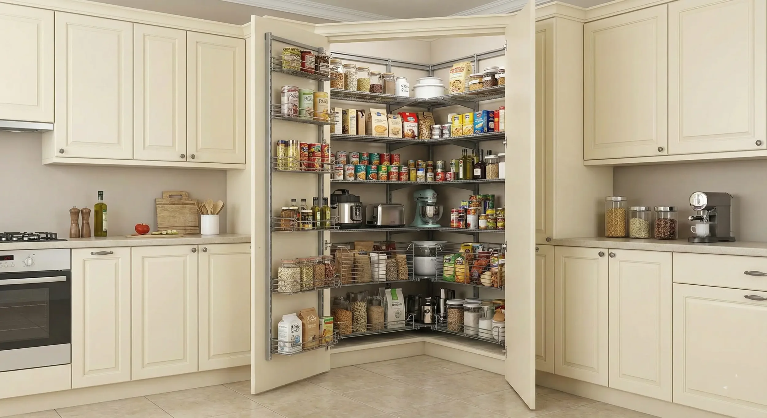For kitchens that require significant storage, a corner pantry is one of the most efficient solutions. These tall, floor-to-ceiling units wrap around corner angles and make exceptional use of vertical space.