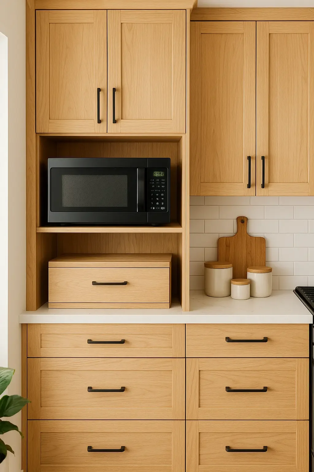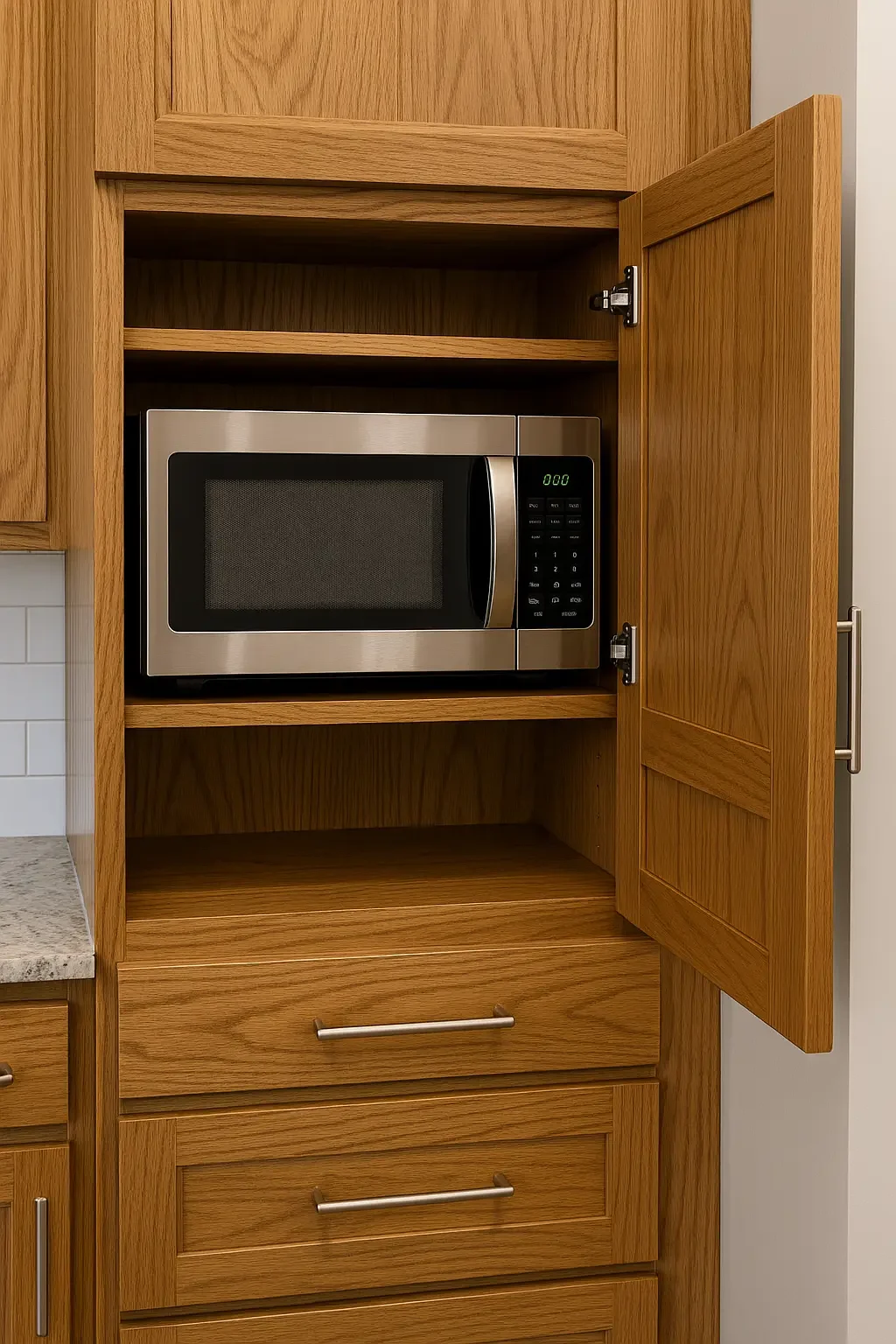 The right door type can make a big difference. Consider lift-up doors for overhead cabinets, swing doors for side openings, or pull-out drawers for under-counter microwaves.